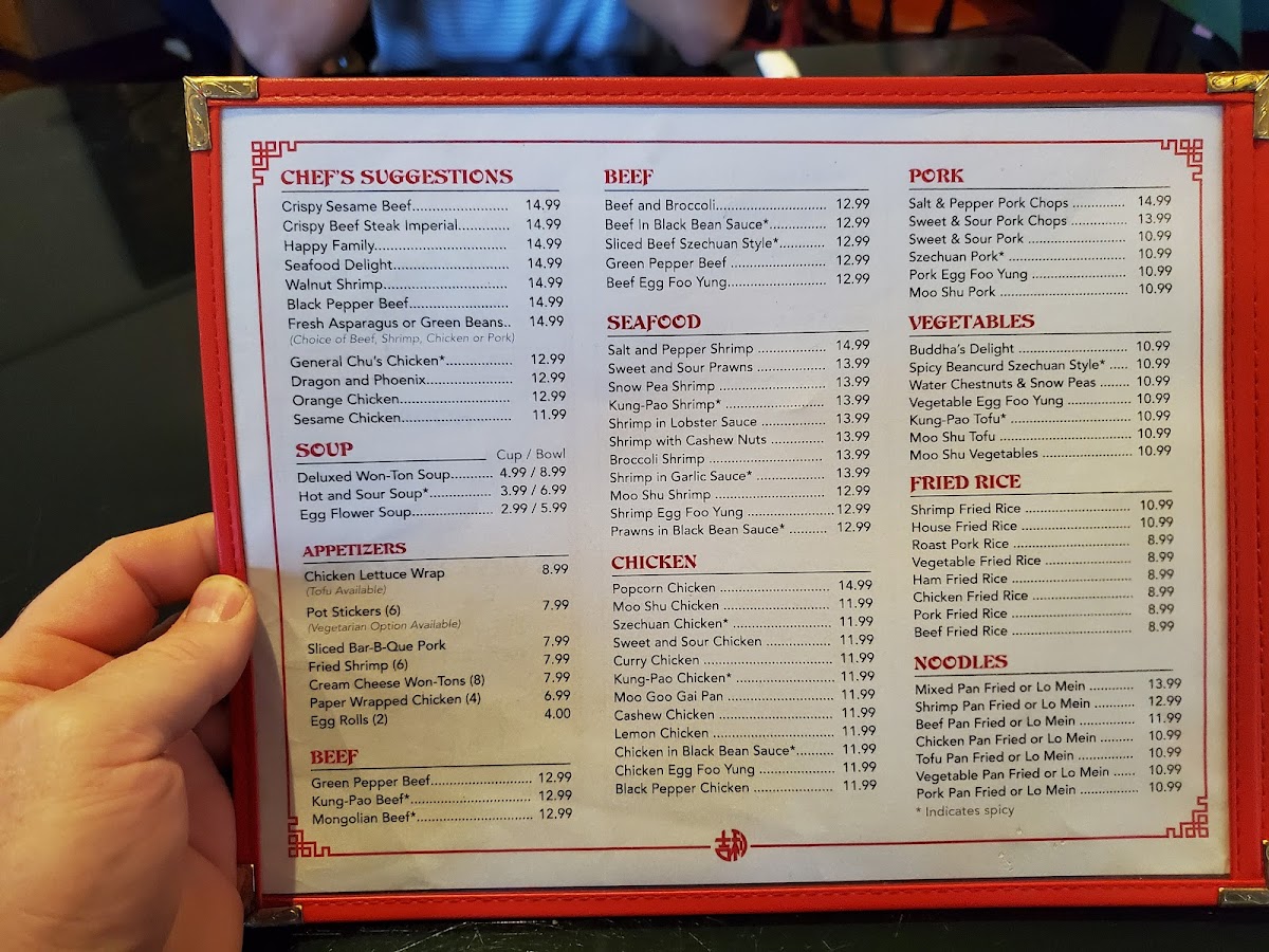 - Poultry Dishes: General Chu's Chicken, Orange Chicken, Cashew Chicken